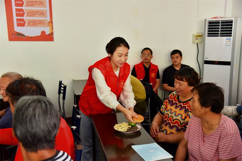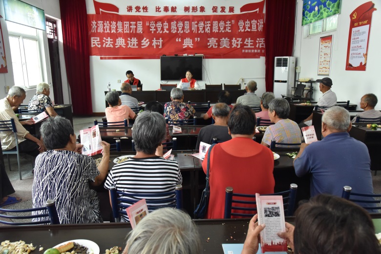 古楊樹村新時(shí)代文明實(shí)踐站會(huì)議室,志愿者們熱火朝天懸掛橫幅,擺放桌椅,布置會(huì)場,待群眾們落座后,又悉心遞上月餅、水果、花生等餐品。圍繞黨史教育和普法宣講主題,志愿者們挨個(gè)向群眾發(fā)放《英雄革命小故事》宣講畫冊(cè),真實(shí)形象接地氣的方式,向大家講述了濟(jì)源革命史上英雄事跡;生動(dòng)活潑舉例子的形式,向大家專題講解了《民法典》在日常生活中的重要性和現(xiàn)實(shí)意義。